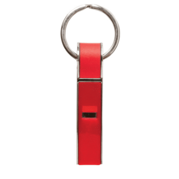 6,3 x 1,5 cm. La medida no incluye la arandela. Metal con detalles en símil cuero y plástico. Llavero silbato.
